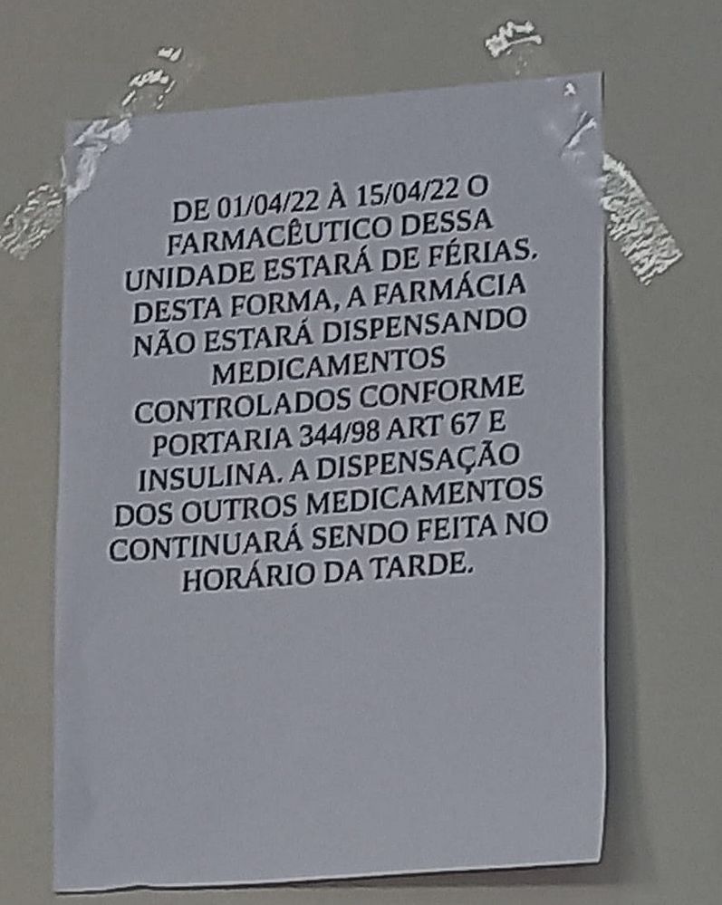 “De 01/04/22 á 15/04/22 o farmacêutico dessa unidade estará de férias, desta forma, a farmácia não estará dispensando medicamentos controlados conforme portaria 344/98 art 67 e insulina. A dispensação dos outros medicamentos continuará sendo feita no horário da tarde”, mostra o texto impresso no cartaz.