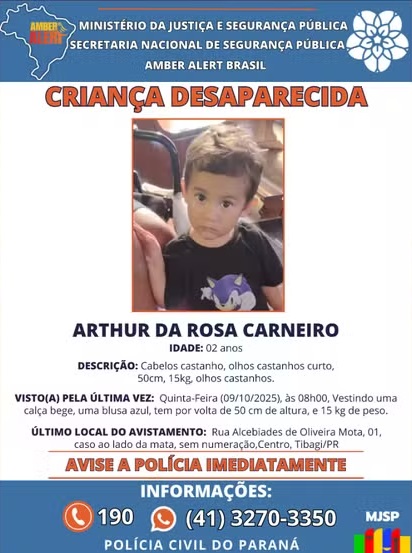 Arthur desapareceu na manhã de quinta-feira (9). Segundo familiares, ele estava dentro de casa e sumiu sem que ninguém percebesse. Desde então, as equipes concentram esforços para tentar localizar o menino na região rural de Tibagi.