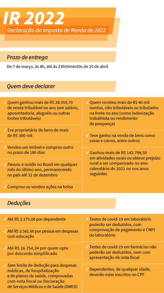 A partir das 8h de hoje (7), o contribuinte poderá acertas as contas com o Leão. Começa o prazo de entrega da Declaração do Imposto de Renda Pessoa Física 2022. Segundo a Receita Federal, a expectativa é que sejam recebidas 34,1 milhões de declarações neste ano, número próximo ao registrado em 2021, quando o Fisco recebeu 34.168.569 documentos.