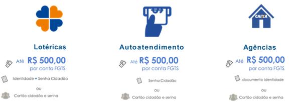 Para quem possui cartão cidadão e senha os saques de até 500 reais poderão ser feitos nas casas lotéricas, nos terminais de autoatendimento ou correspondentes Caixa Aqui. Basta apresentar documento de identificação.