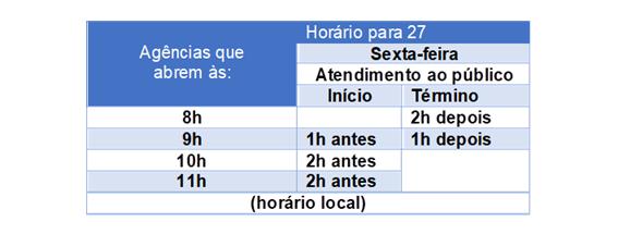 Para facilitar o atendimento, 2.302 agências da Caixa abrirão em horário estendido nesta sexta (18), segunda (21) e terça-feira (22). As unidades também abrirão no sábado (19), das 9 às 15h (horário local).
