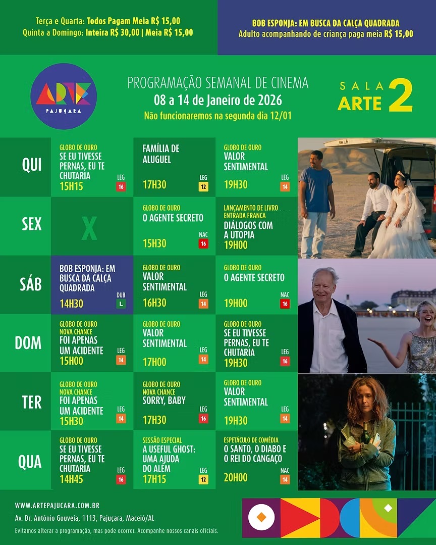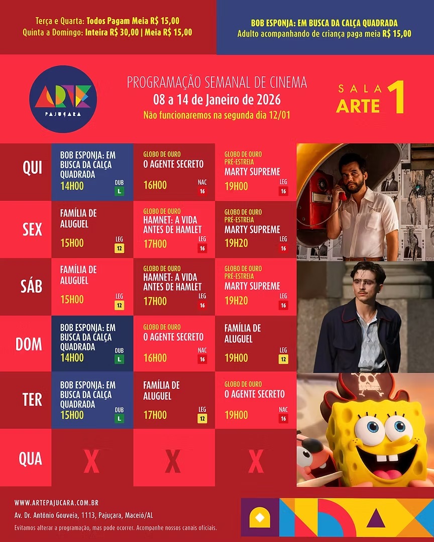 Para conferir a programação completa de todos os filmes em cartaz no Arapiraca Partage Shopping, Centerplex (Shopping Pátio Maceió), Cinesystem (Parque Shopping) e Kinoplex (Maceió Shopping): basta clicar aqui. Já para o Shopping da Vila, em Delmiro Gouveia, pode ser conferida aqui.