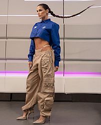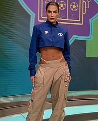 O look, composto por cropped azul de mangas longas, com a logo do canal e da emissora, ganhou sensualidade extra com uma calça cargo de cintura baixíssima, deixando em evidência parte da calcinha da atriz. Confira: