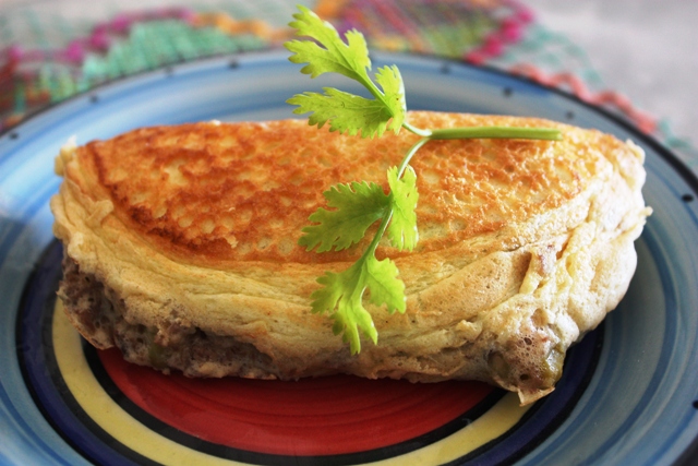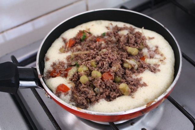 Esquente o óleo ou manteiga (pouco apenas para untar) de preferencia numa frigideira antiaderente (pequena) e vá colocando a massa da omelete. Em seguida deite a carne moída e por fim dobre no formato de tapioca.