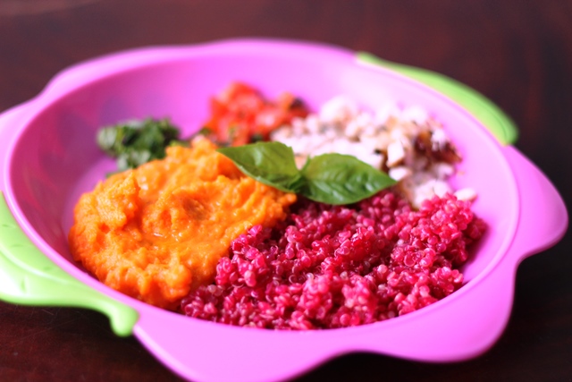 Almoço da Florinha: quinoa de beterraba, purê de abóbora, peixe e saladinha