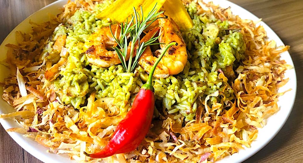 Arroz dos Incas é outra preciosidade da chef Thaísa de Mello, os grãos ficam verdinho porque é preparado na pasta de coentro, espinafre e páprica doce, e vem misturado com camarão, polvo e lula.