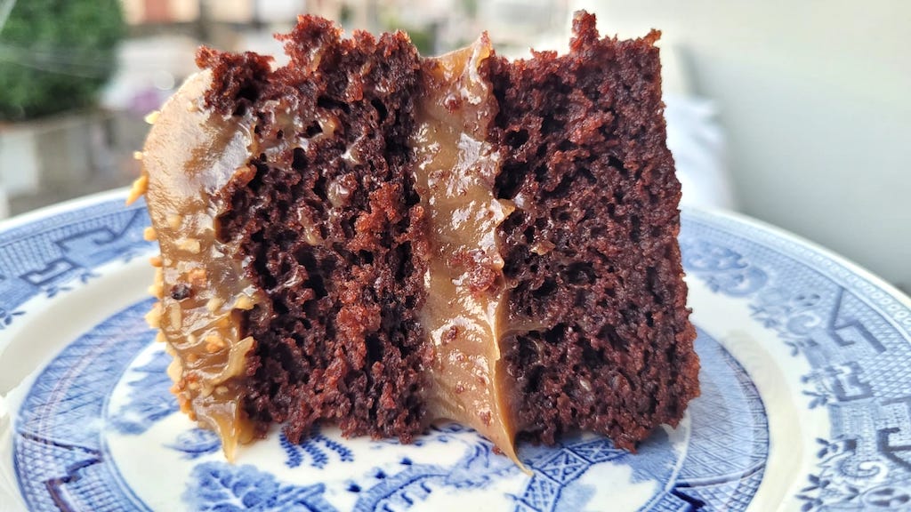 Bolo de chocolate com farinha de arroz e cobertura de doce de leite de castanha de caju