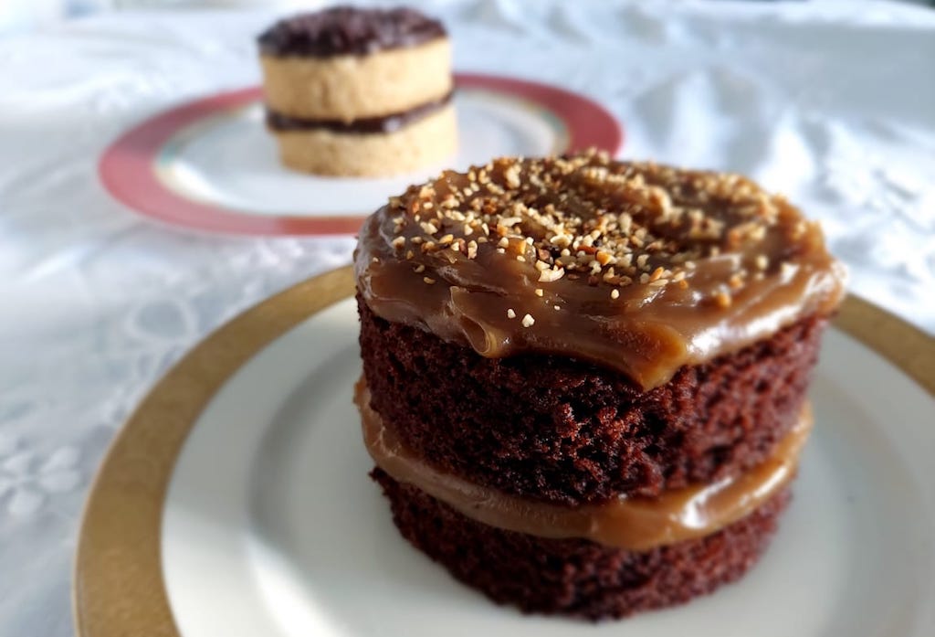 Bolo de chocolate com farinha de arroz e cobertura de doce de leite de castanha