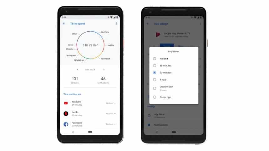 No caso do Google, essa medição é exibida em um painel de controle, que mostra um gráfico em círculo no meio e uma lista dos apps mais acessados. Um toque em um deles deixa você definir um limite de uso por dia, variando de 15 minutos a um intervalo personalizado e permitindo até mesmo pausar o aplicativo. Essa limitação auto-imposta ainda é ajudada por um aprimoramento no recurso Não perturbe, que agora pode acinzentar toda a tela e se ativar automaticamente na hora de dormir.