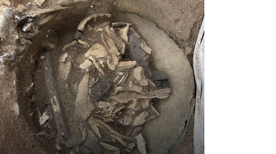 As análises iniciais também sugeriram a presença de objetos funerários no balde. Entre eles, os pesquisadores cuidadosamente recuperaram um pente delicado, mas quase intacto, de dupla face, com dentes finos de um lado e mais largos do outro, provavelmente feito de chifre de cervo. Diferente dos ossos, o pente não foi queimado.