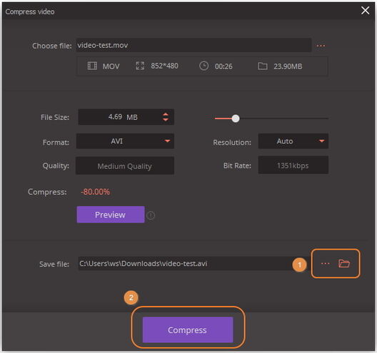A ferramenta de compressão de vídeo (Video Compress) permite que você comprima o tamanho do vídeo com um clique e visualização em tempo real. Você poderá customizar intuitivamente a resolução de vídeo, o tamanho do arquivo, a qualidade do vídeo, o formato de vídeo, o caminho de saída e outros recursos com essa ferramenta.
