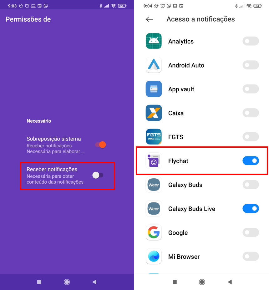 3. De volta a tela anterior, marque a chavinha de “Receber notificações” e habilite o “Flychat” na lista exibida;