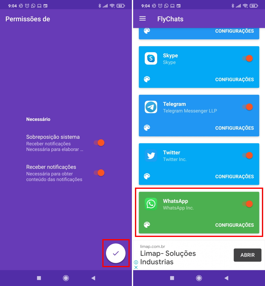 4. Toque no ícone de “confirmar” e na lista de aplicativos, certifique-se de que o WhatsApp está marcado.