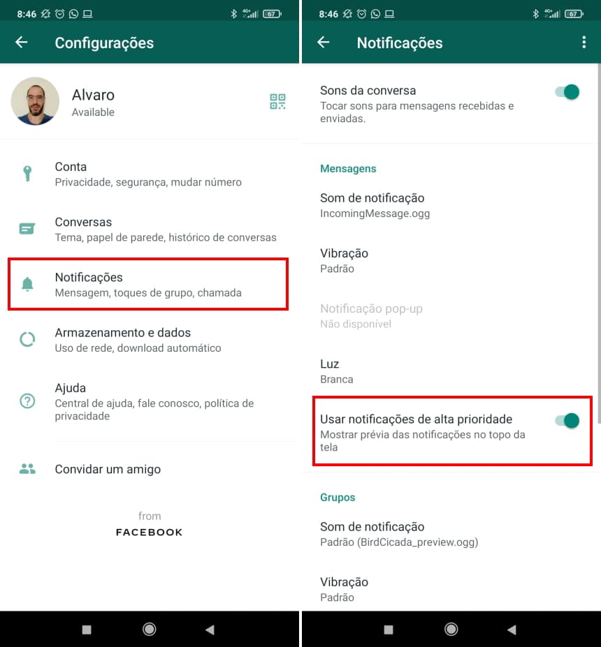 2. Toque em “Notificações” e marque a chavinha de “Usar notificações de alta prioridade”. Isso apenas permite que as notificações do WhatsApp tenham suas prévias exibidas. No iOS, esta função aparece com o nome “Mostrar pré-visualização”.