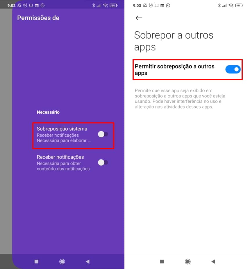 2. Abra o aplicativo baixado normalmente e toque na chavinha de “Sobreposição sistema”. Já na nova tela, conceda a permissão necessária para o funcionamento do programa;