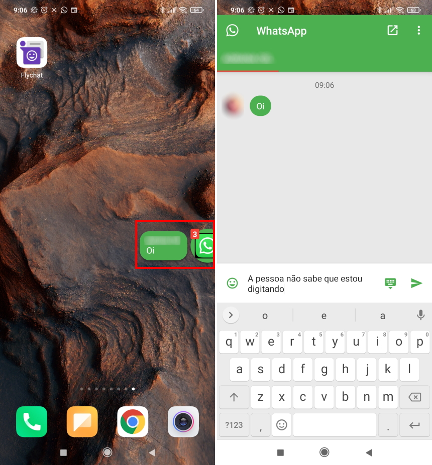 Quando você receber uma mensagem no WhatsApp, o FlyChat exibirá uma notificação do tipo “bubble” em que será possível visualizar e responder as pessoas sem ser denunciado que está digitando.