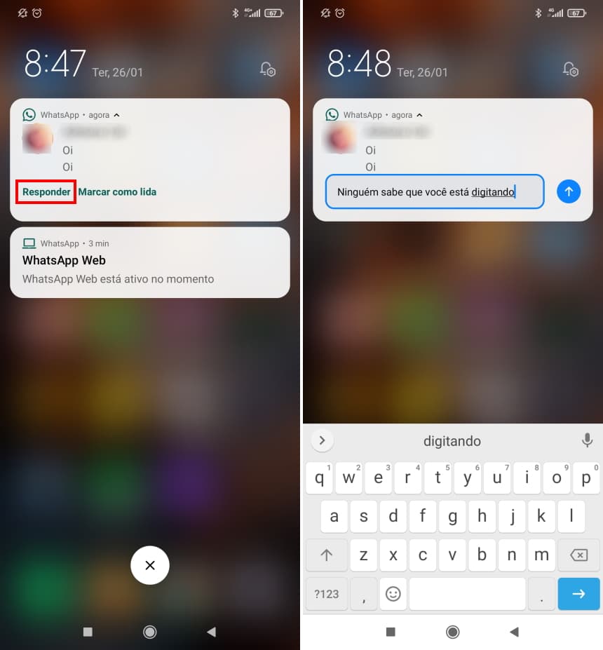 Agora que a configuração no WhatsApp já foi realizada, ao receber uma mensagem no aplicativo, você deverá respondê-la pela área de notificações do celular, assim como sugere a imagem abaixo. Assim, o truque consiste em ao invés de entrar na “tela de conversa”, responder as pessoas usando o sistema de notificação do celular, que não ativa o “digitando” do mensageiro.