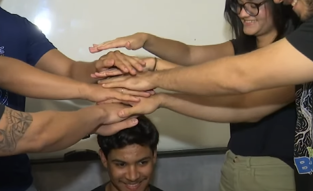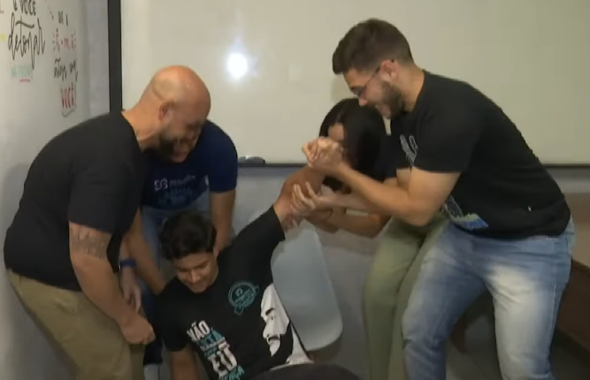 Colocar a mão em cima é para se concentrar e manter a sincronia. Como são quatro pessoas, cada uma vai aplicar uma força paralela e, daí, conseguir levantar.
