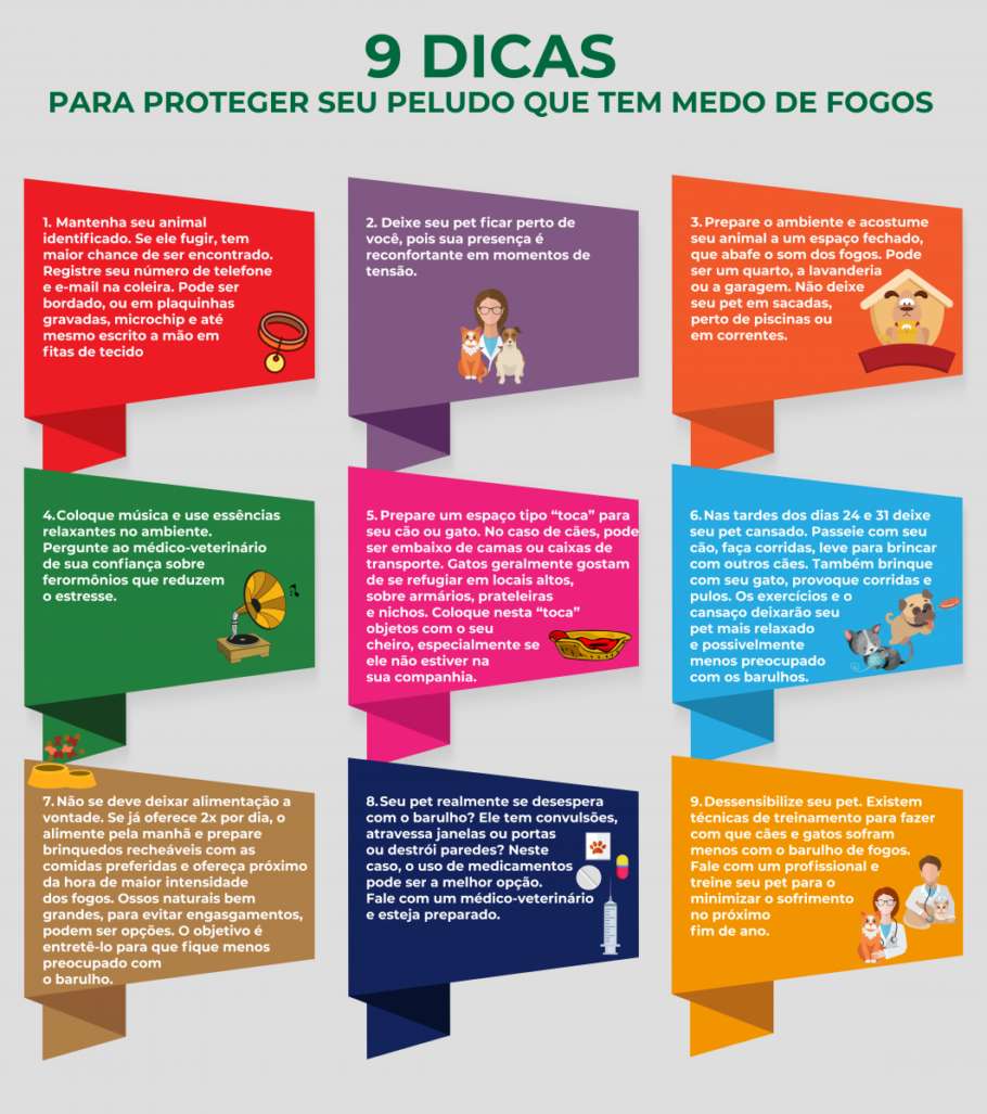 O Conselho Federal de Medicina Veterinária reuniu em um material outras dicas e orientações aos tutores que também podem ajudar a minimizar os efeitos desagradáveis dos fogos nos animais e trazer mais segurança. Confira a seguir: