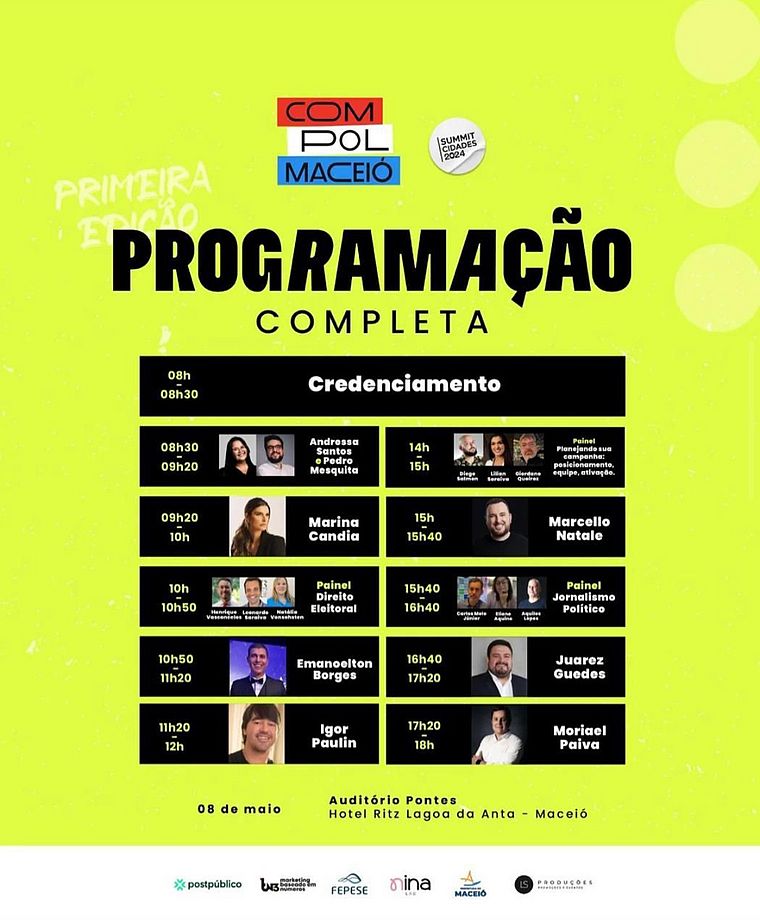 Falta uma semana para o Compol Maceió, o maior evento de comunicação política e institucional do Brasil. A imersão sobre campanhas ocorre na próxima quarta-feira (8) e poucas vagas ainda estão disponíveis. A iniciativa é direcionada à estudantes, profissionais da área e quem deseja entrar no mercado. Com speakers de todo país, será apresentado todo processo da construção de uma candidatura de sucesso, do planejamento às principais inovações e cases.