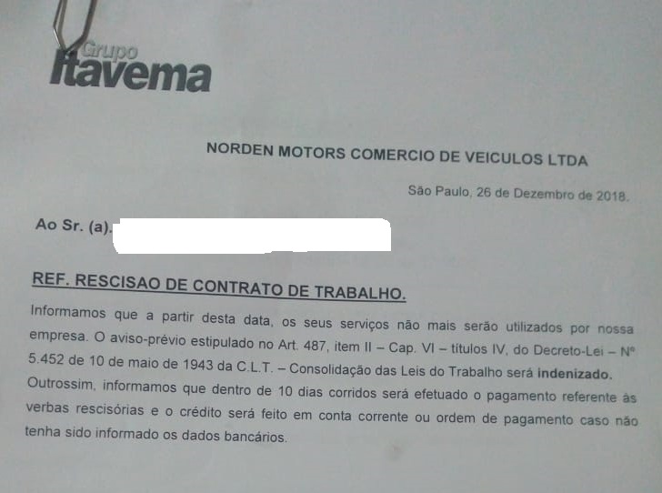 Tivemos acesso à rescisão de contrato de um dos funcionários que confirma que não seria necessário nem mesmo o cumprimento do aviso prévio.