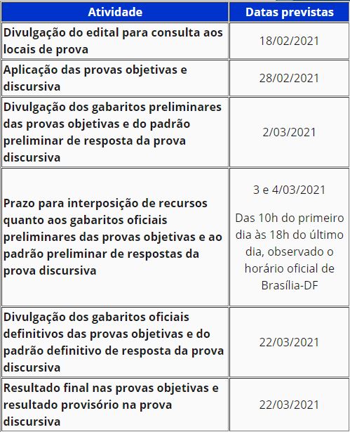 De acordo com a publicação, as aguardadas provas objetivas e discursivas estão previstas para 28 de fevereiro. O resultado final da seleção está programado para 22 de março. Veja as datas: