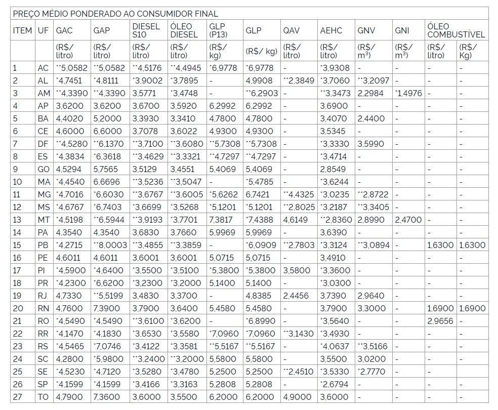 O Conselho Nacional de Política Fazendária (Confaz) divulgou nova tabela de Preços Médios Ponderados ao Consumidor Final (PMPF) de combustíveis em todo o país.