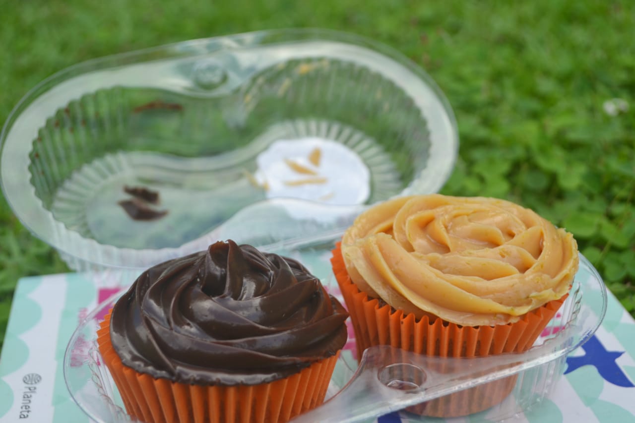A dupla de cupcake (bolinhos de cenoura) cobertura de brigadeiro de chocolate amargo e de laranja, ambos sem lactose e sem glúten