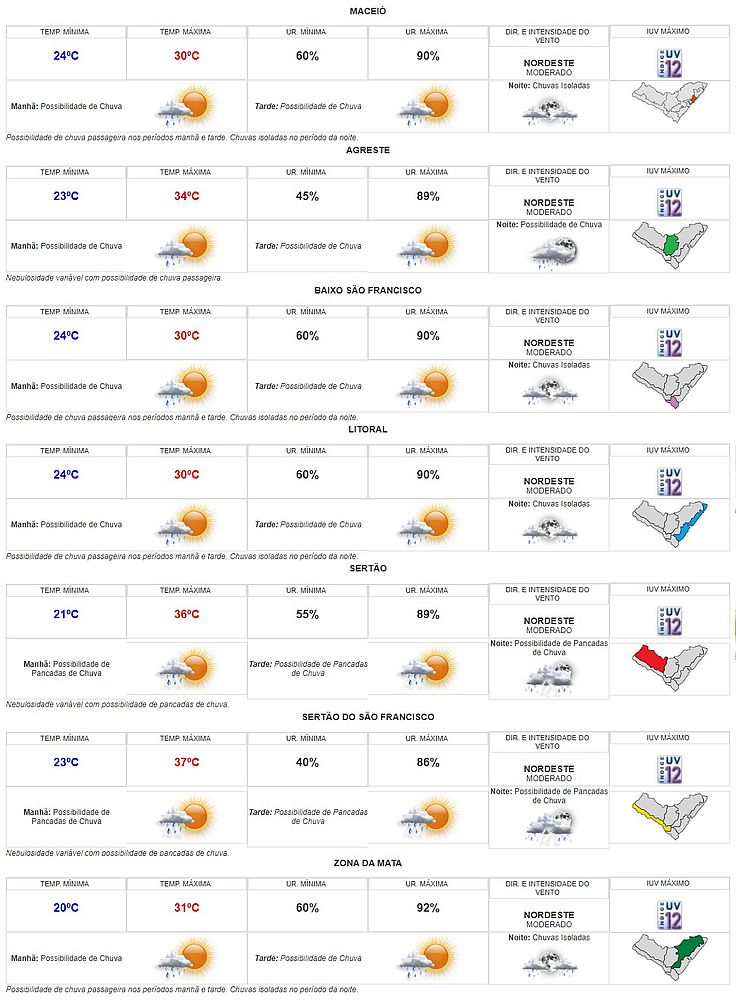 A meteorologia prevê chuva passageira nos períodos da manhã e da tarde, e chuvas isoladas durante à noite na capital alagoana e em outras regiões do Estado. Os maceioenses que foram às ruas, inclusive, já se depararam com o tempo nublado desde cedo e muitos saíram com guarda-chuva por precaução. A previsão do tempo é a mesma para a Zona da Mata, para o Litoral e para o Baixo São Francisco.