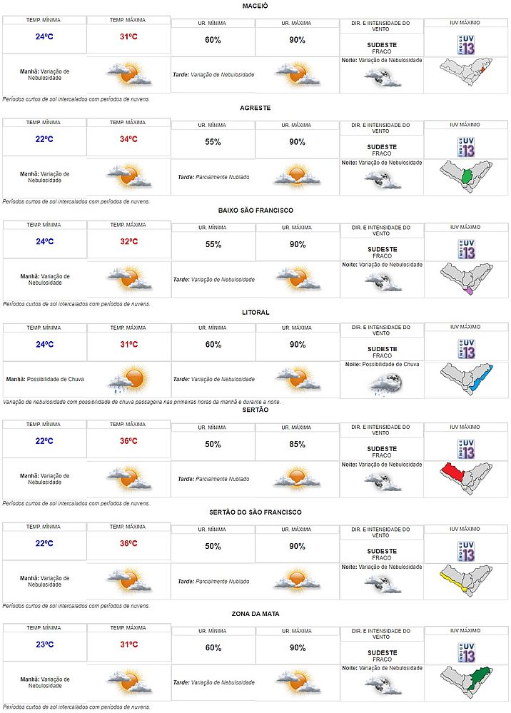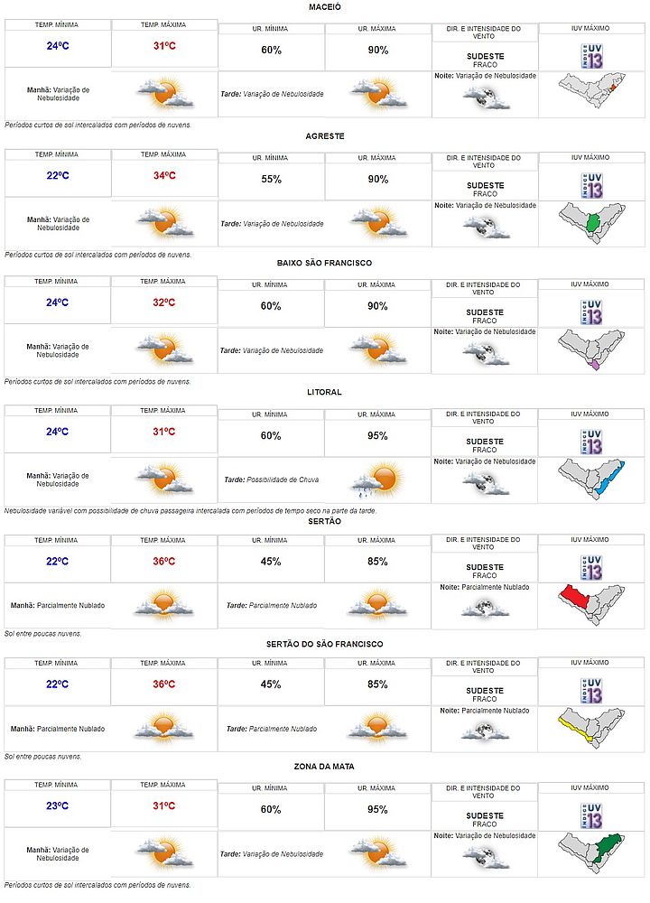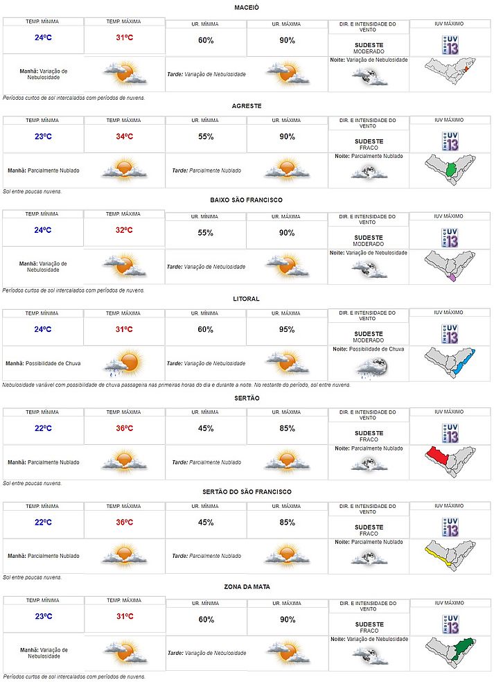 A previsão do tempo para este final de semana em Alagoas tem variação de temperatura entre 22ºC e 36ºC, com os picos nas regiões do Sertão e Sertão do São Francisco. Confira abaixo as informações completas fornecidas pela Secretaria de Estado do Meio Ambiente e Recursos Hídricos (Semarh) para esta sexta-feira, 10, o sábado, 11, e o domingo, 12, em todas as regiões do estado.
