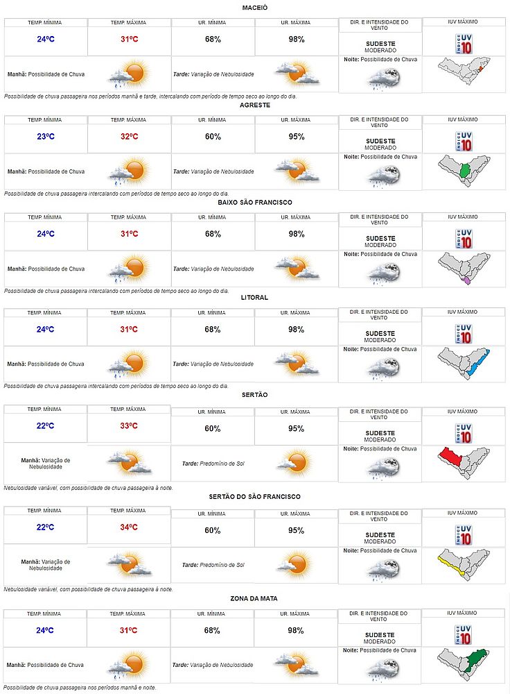 A meteorologia prevê chuva em Maceió e na região metropolitana durante a manhã e a noite deste domingo. No período da tarde, o tempo pode ficar nublado, mas sem chuva. A previsão é a mesma para o Agreste, o Litoral, a Zona da Mata, e o Baixo São Francisco.