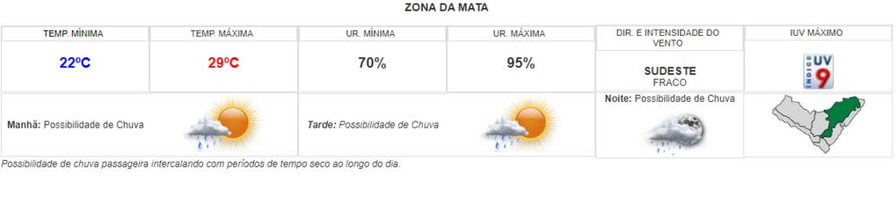 Na Zona da Mata, a previsão é de possibilidade de chuva passageira intercalando com períodos de tempo seco ao longo do dia e a temperatura deve ficar entre 22º e 29ºC. Confira em detalhes abaixo: