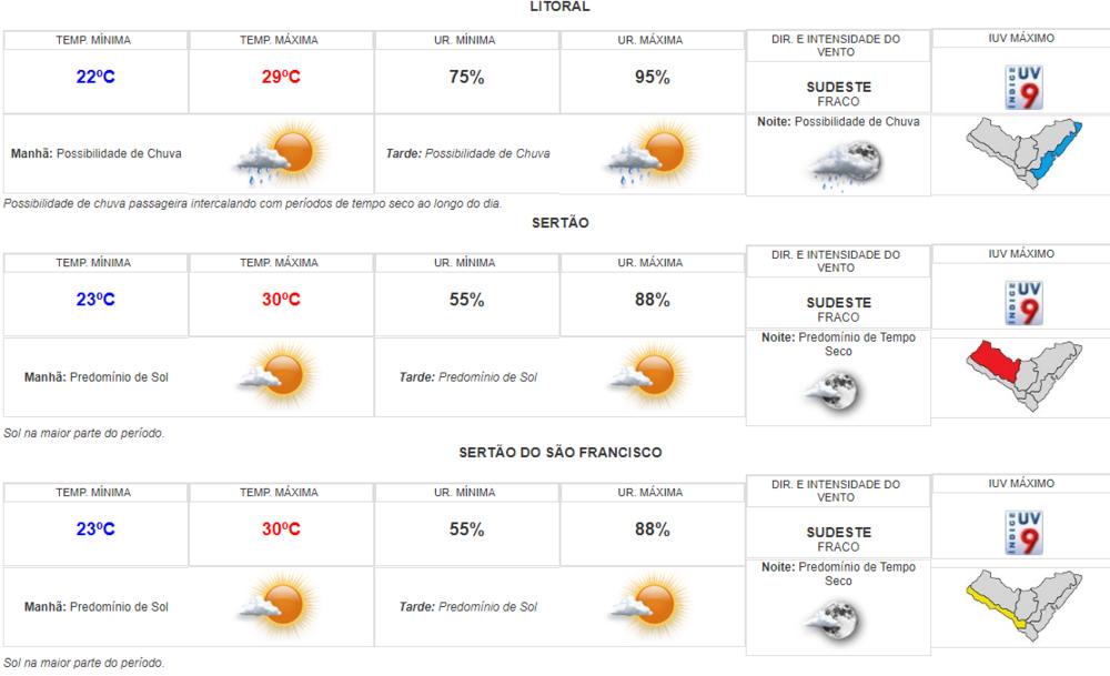 Para o Sertão, a previsão é de sol na maior parte do período e a temperatura deve variar entre 23º C e 30º C. No Sertão do São Francisco, a previsão é de sol na maior parte do período e a temperatura deve variar entre 23ºC e 30ºC.