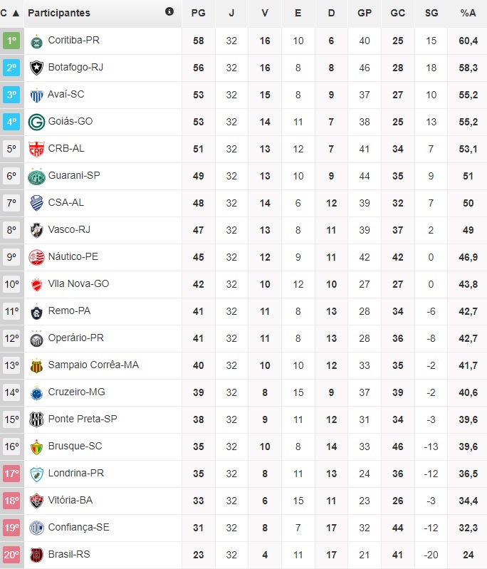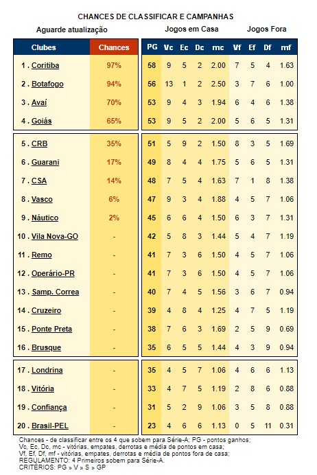 Fora de casa, o Avaí foi derrotado pelo Operário e parou na terceira colocação com 53 pontos e 70% de chances. O Guarani aproveitou os tropeços, venceu o Sampaio Corrêa no Maranhão e saltou para sexta posição, com 49 pontos e 17%. Quem também encurtou a distância foi o CSA, que venceu o confronto direto com o Vasco em São Januário, pulou para sétimo, com 48 pontos e 14%. O Gigante da Colina estacionou nos 47 pontos, caiu para oitavo e tem 6%. O último clube a aparecer com chances no Infobola é o Náutico, que perdeu para o Brasil em Pelotas, ficou em nono lugar, com 45 pontos e apenas 2%.
