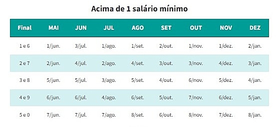 Para estes, a primeira parcela começará a ser paga no dia 25 de maio, visando pagar primeiro os beneficiários que possuem o número 1 como último dígito do NIS. Aqueles que recebem mais do que um salário mínimo devem começar a receber a primeira parcela no dia 1º de junho.