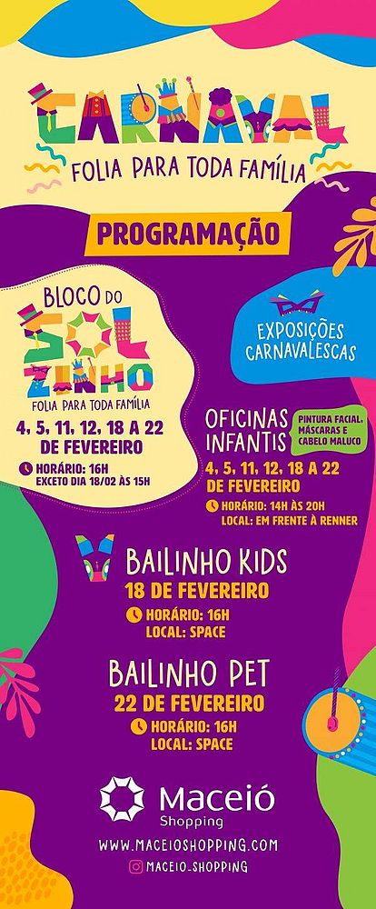 O Maceió Shopping preparou uma programação especial de Carnaval para alagoanos e turistas que vão curtir esses dias de folia em nossa capital, com atrações para todas as idades. As lojas e estabelecimentos da praça de alimentação, além de cinemas e parques de diversão também funcionarão.