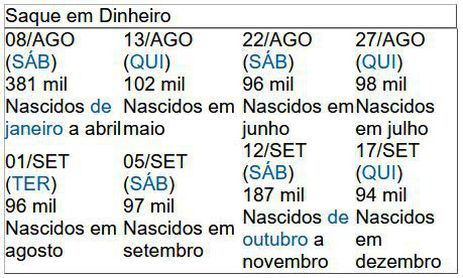 A portaria diz ainda que nas datas indicadas nesse calendário, os recursos estarão disponíveis apenas para o pagamento de contas, de boletos e para realização de compras por meio de cartão de débito virtual ou QR Code.