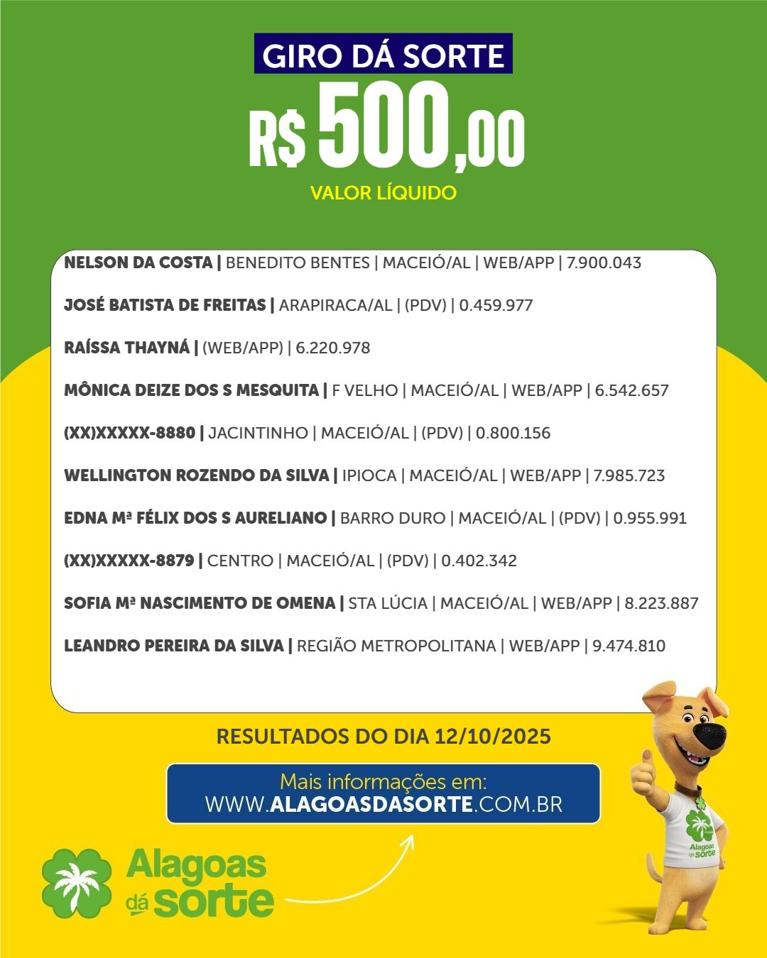 Confira o resultado do Alagoas dá Sorte deste domingo, 12 de outubro: