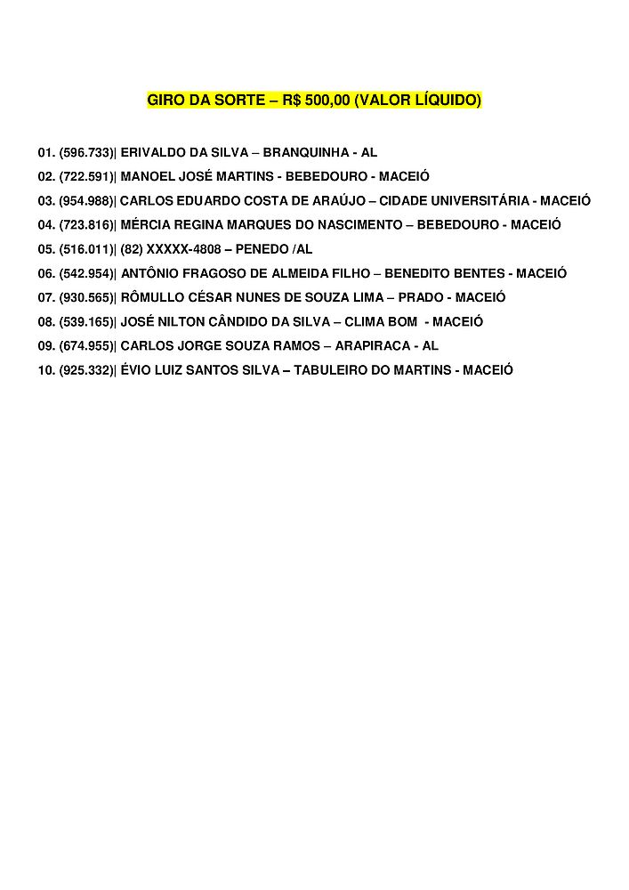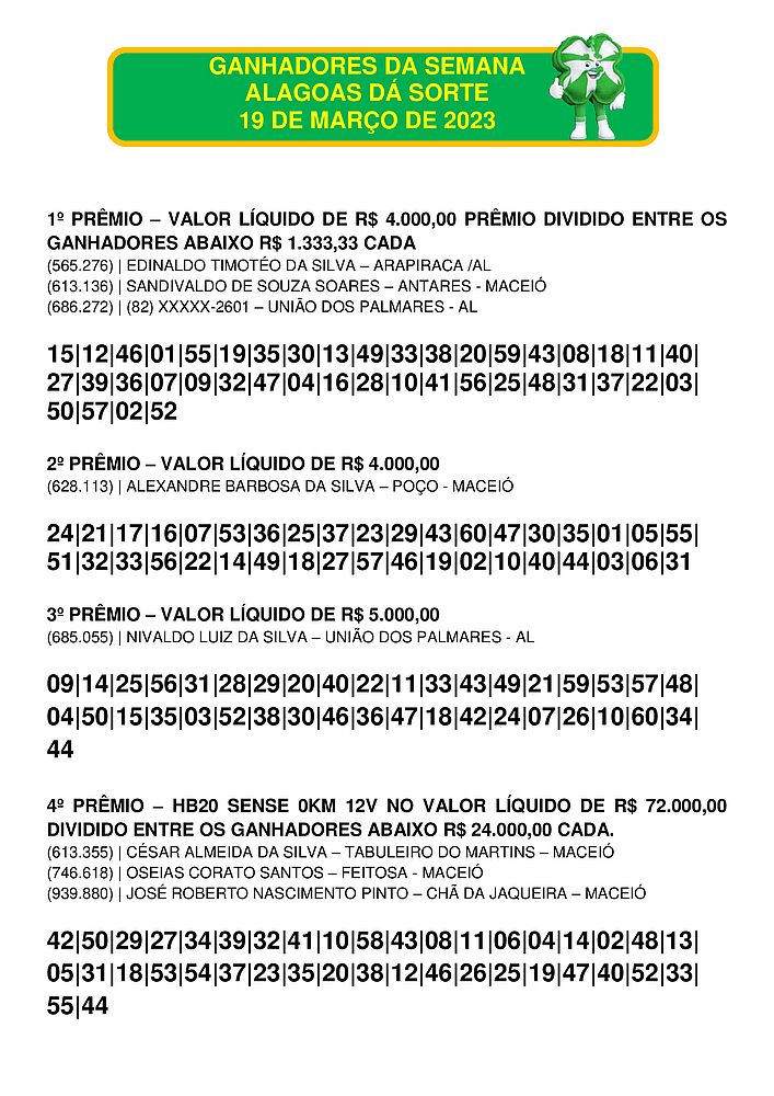 Confira abaixo o resultado do Alagoas dá Sorte deste domingo, 19.