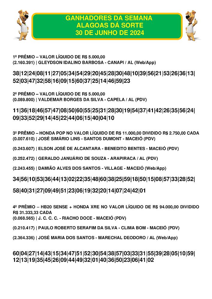 Confira os resultados do Alagoas dá Sorte deste domingo, 30/06.