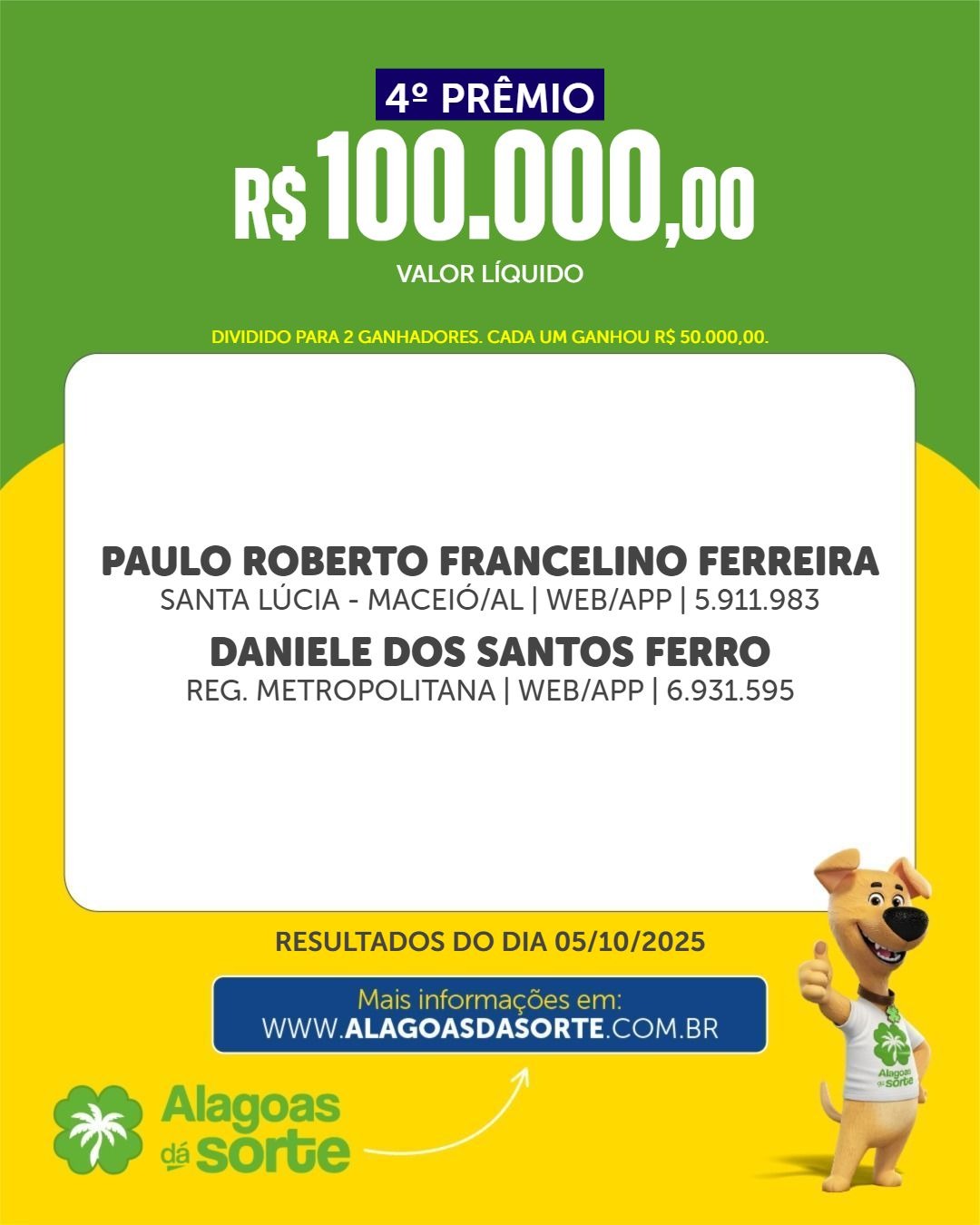 Confira o resultado do Alagoas dá Sorte deste domingo, 5 de outubro: