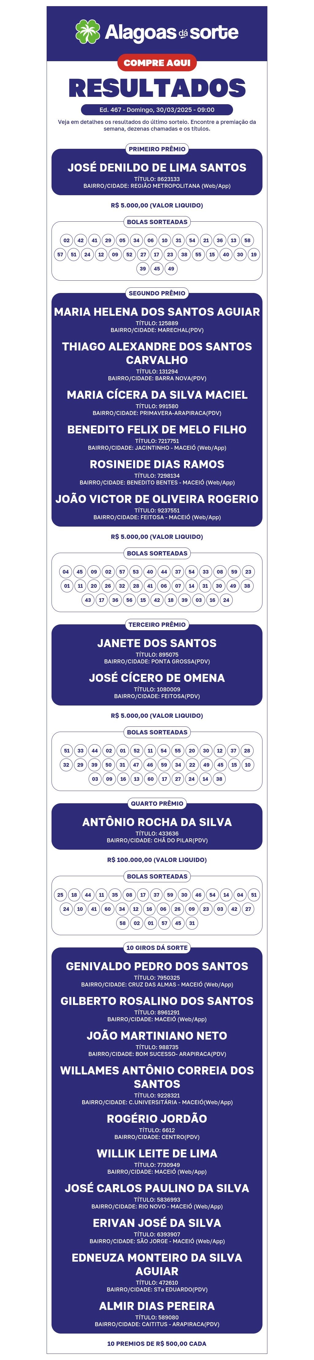Confira o resultado do sorteio do Alagoas dá Sorte deste domingo, 30: