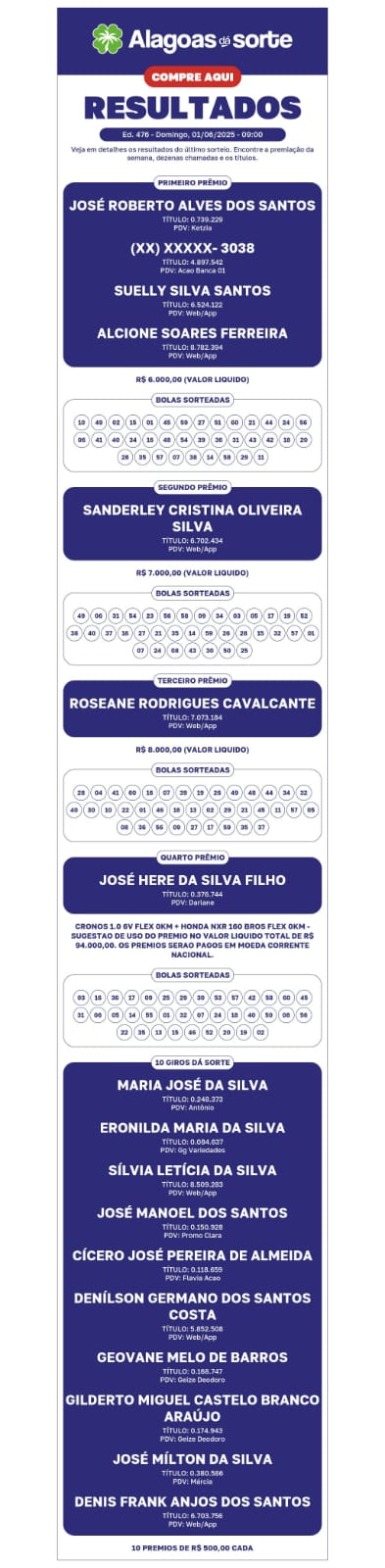 Confira os ganhadores do sorteio do Alagoas dá Sorte deste domingo, 7 de dezembro