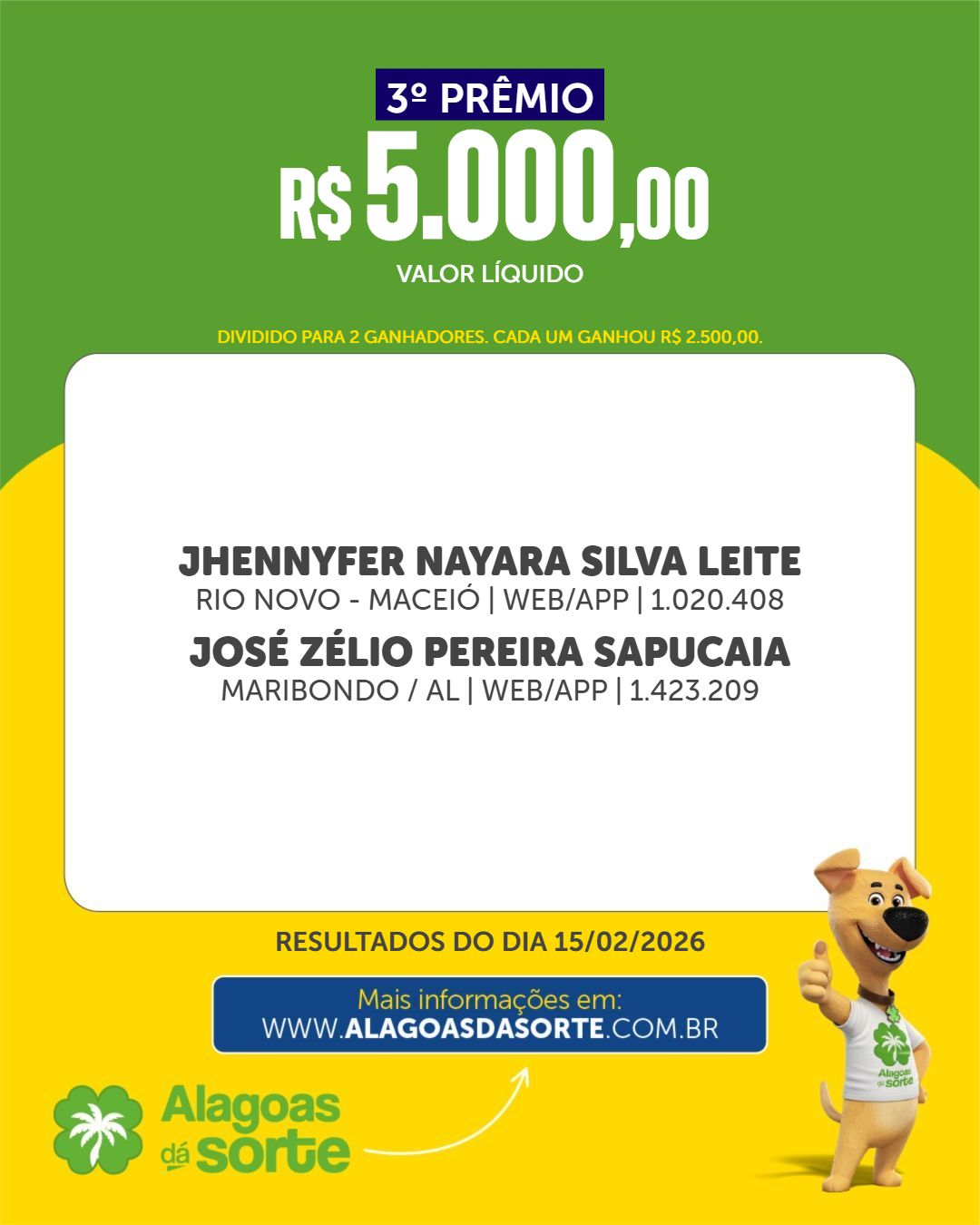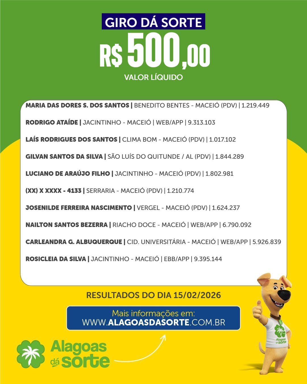 Confira os ganhadores do Alagoas dá Sorte deste domingo, 8 de fevereiro de 2026