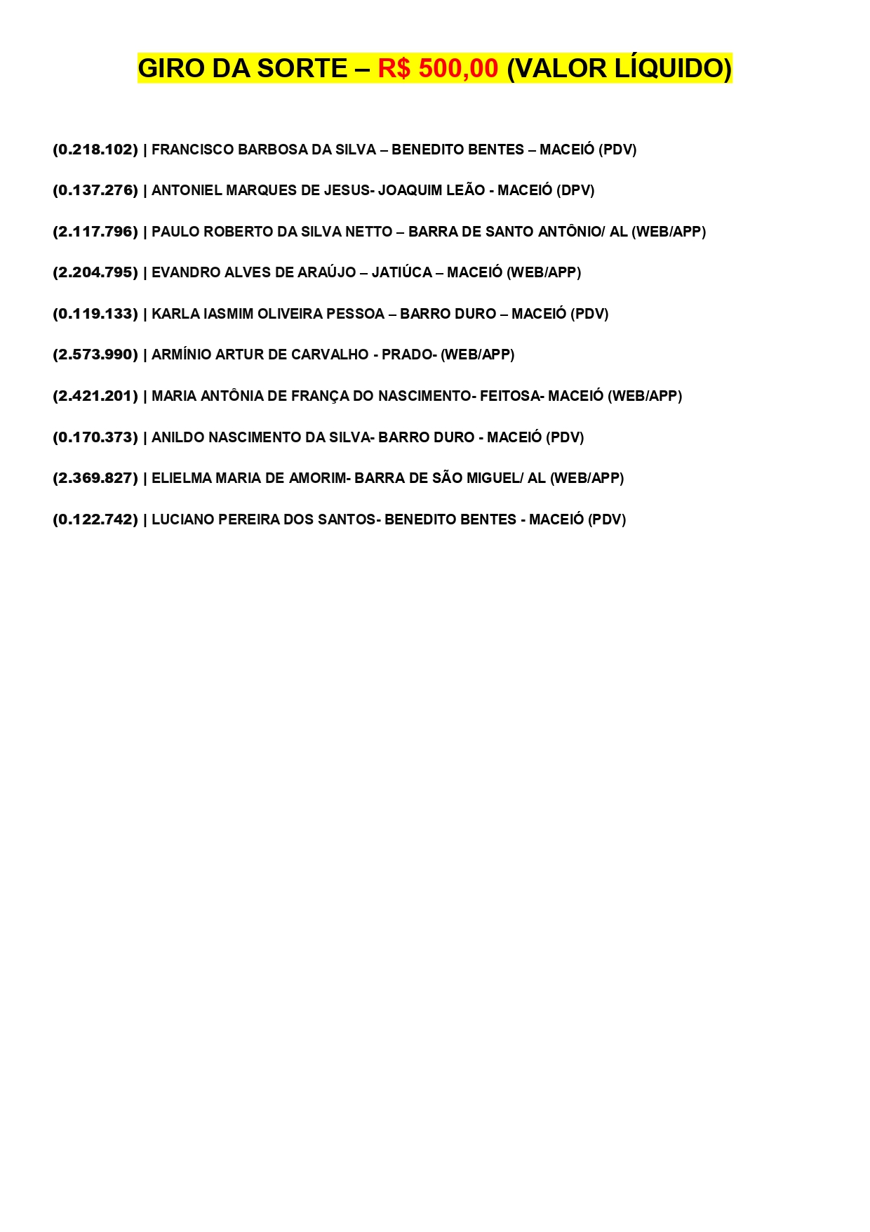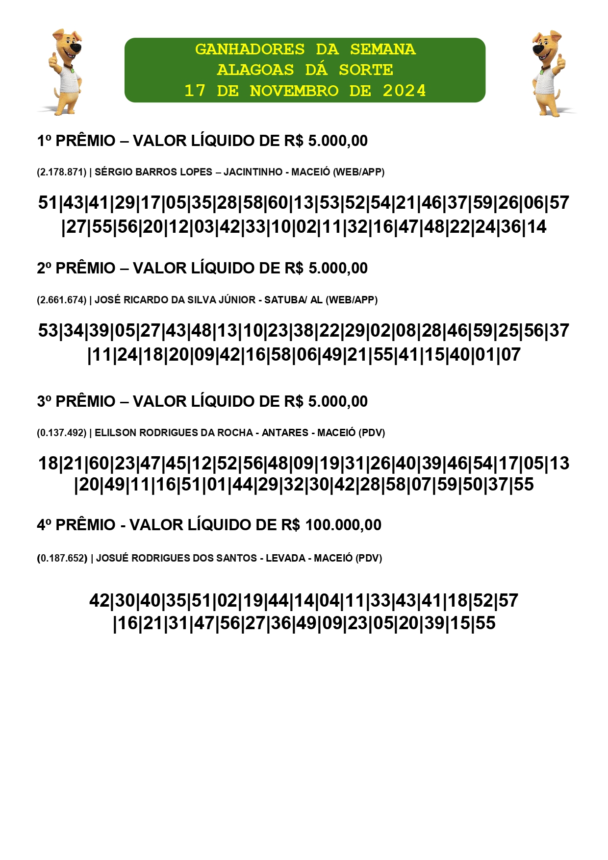 Confira os ganhadores do Alagoas dá Sorte deste domingo, dia 17 de novembro de 2024.