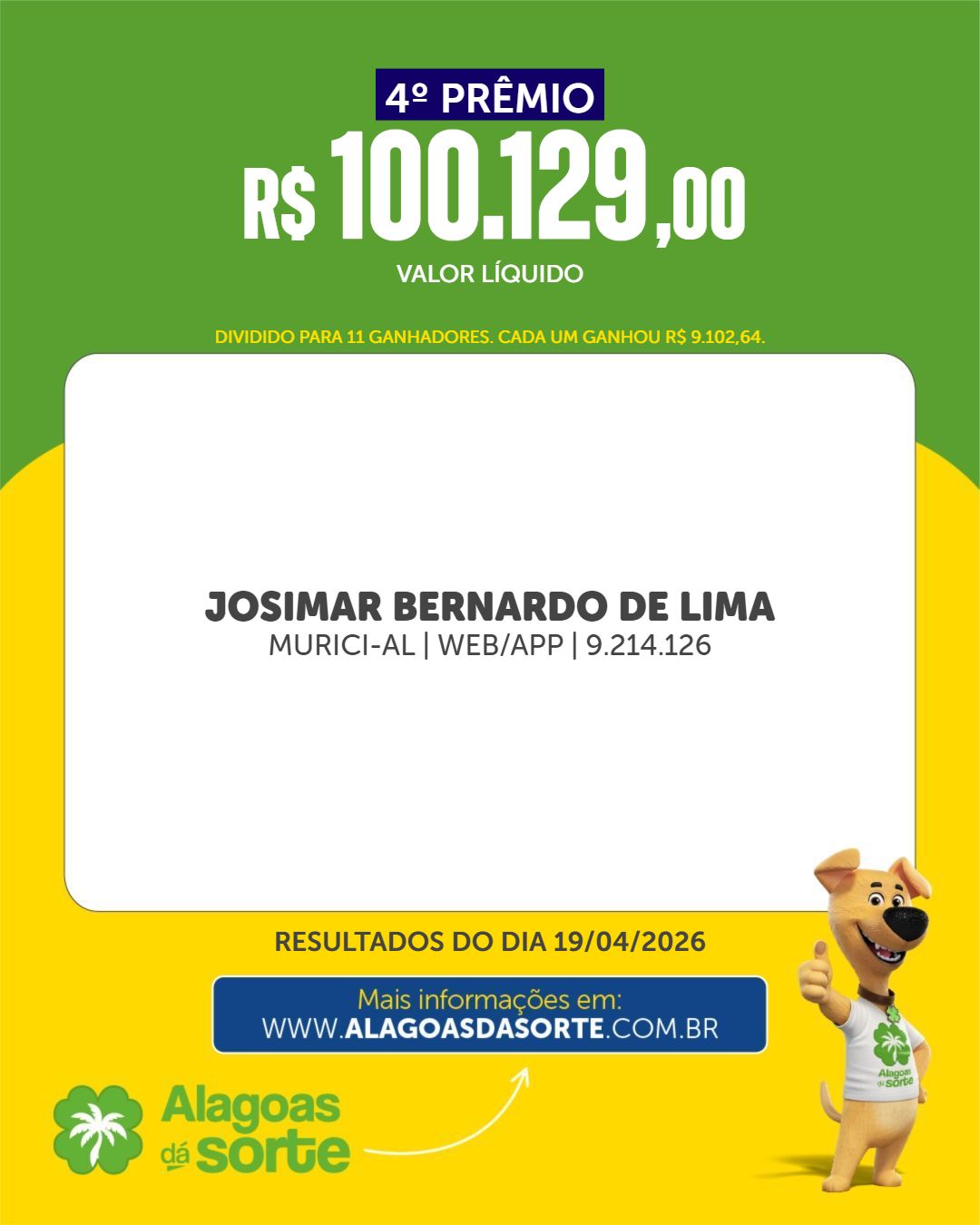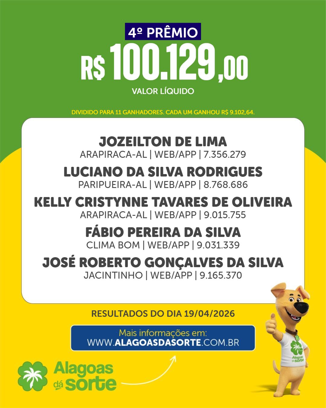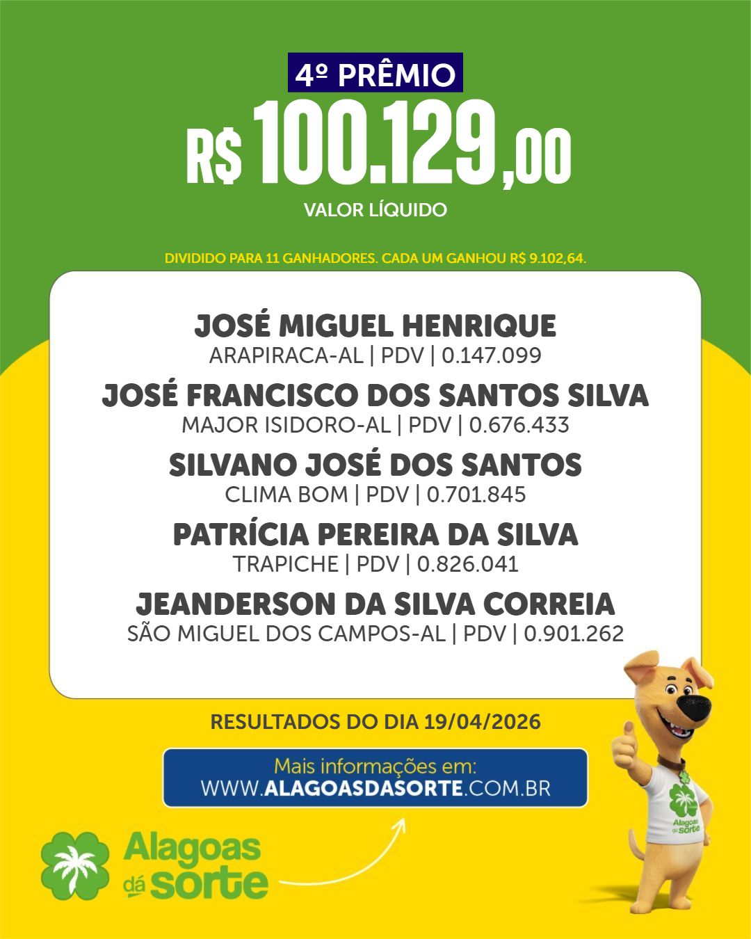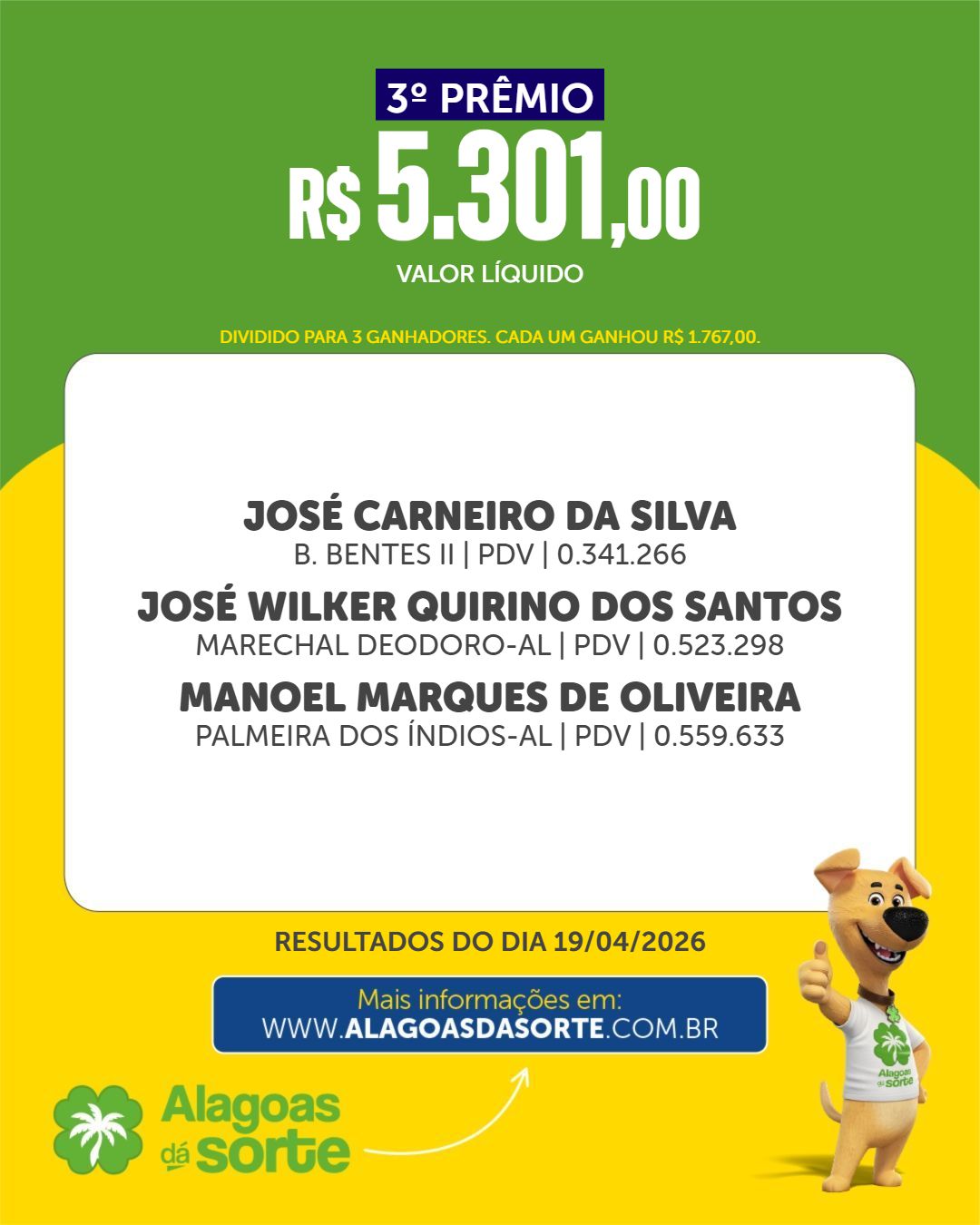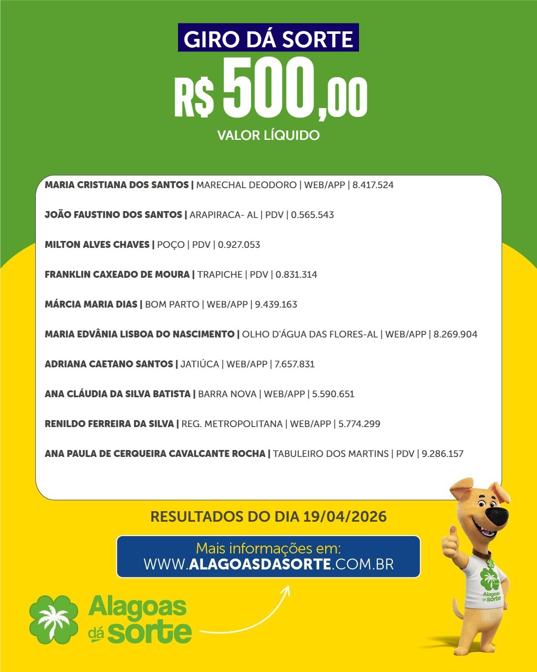 Confira os ganhadores do Alagoas dá Sorte deste domingo, 19 de abril de 2026.