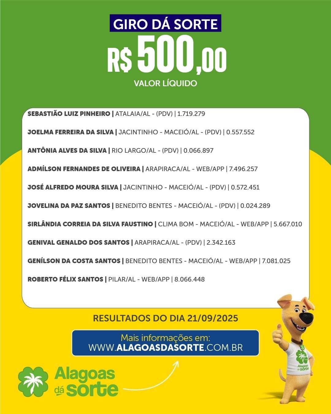 Veja quem são os ganhadores do Alagoas dá Sorte deste domingo, 21 de setembro de 2025