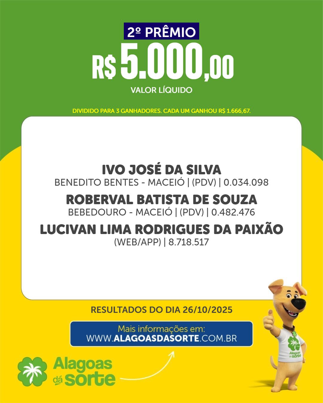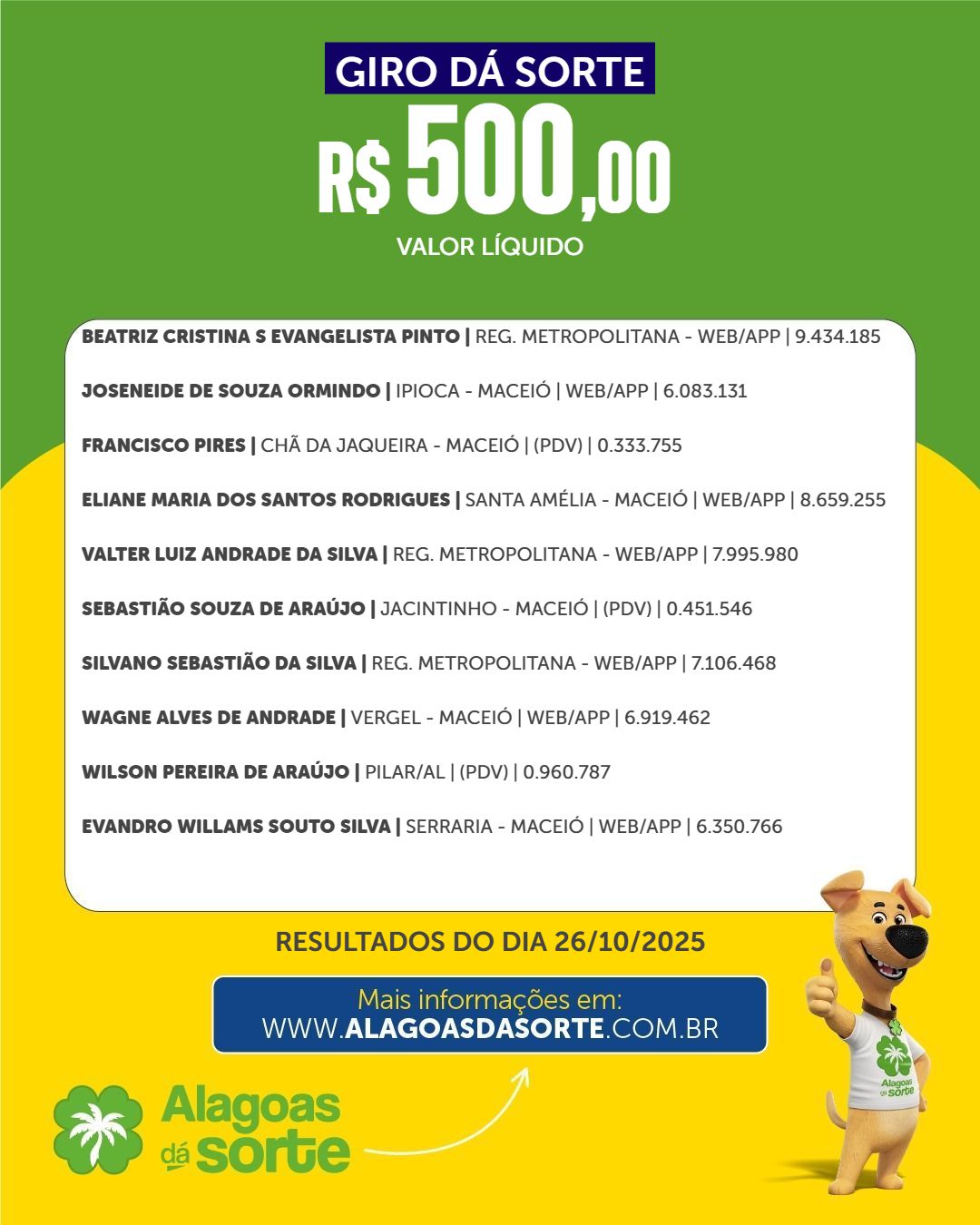 Confira os ganhadores do sorteio do Alagoas dá Sorte deste domingo, 7 de dezembro