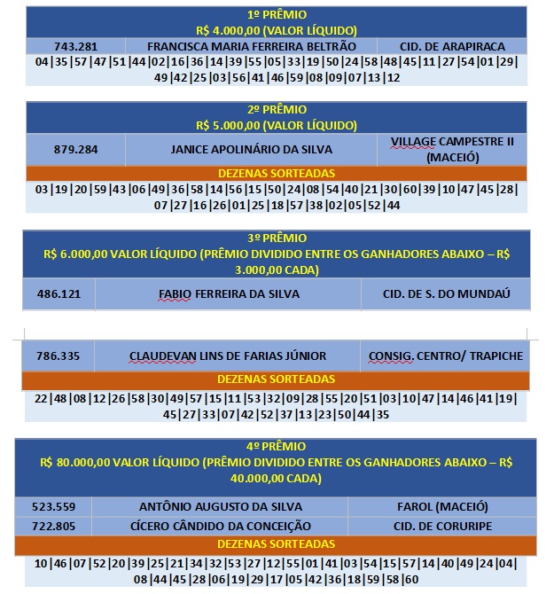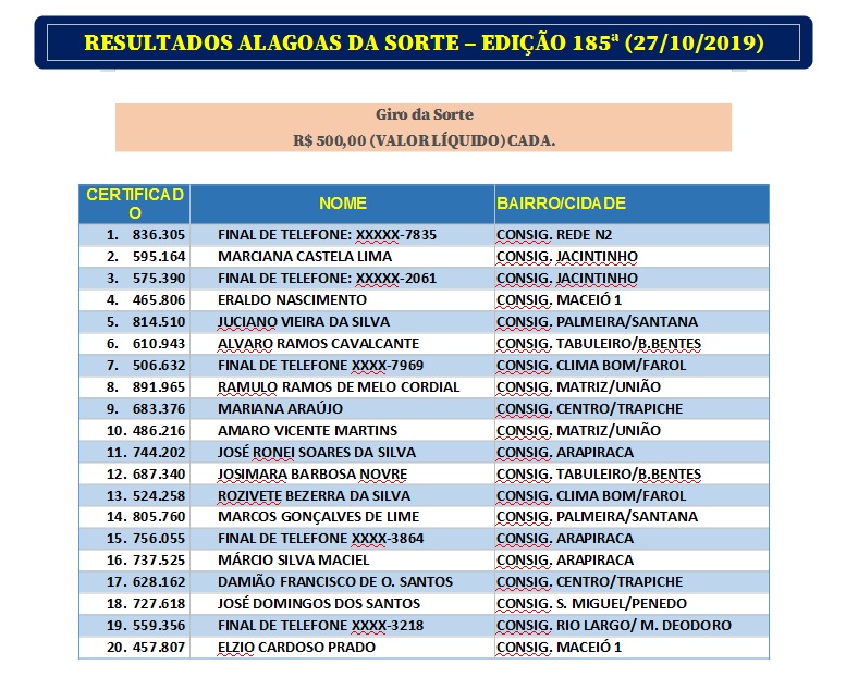 Veja abaixo o resultado do Alagoas dá Sorte deste domingo, 27 de outubro de 2019, edição 185ª.