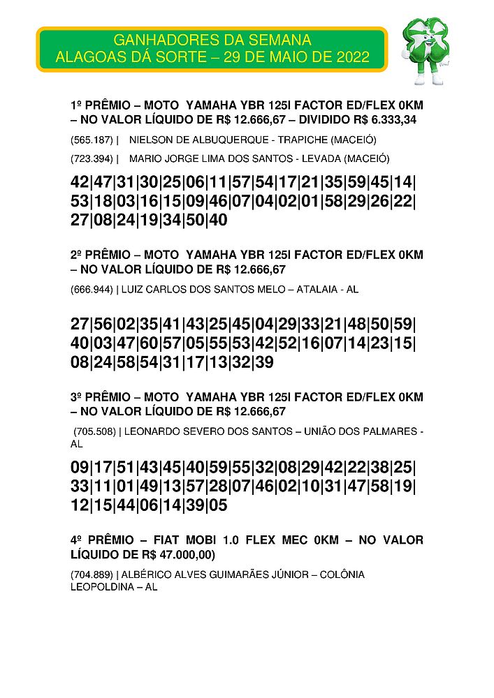 Confira abaixo os resultados do Alagoas Dá Sorte deste domingo, 29 de maio de 2022.